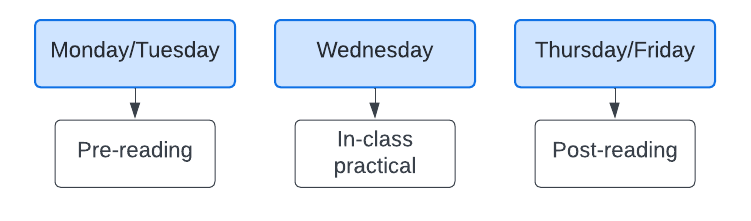 - Pre-class reading, which you are expected to complete on Monday/Tuesday each week.