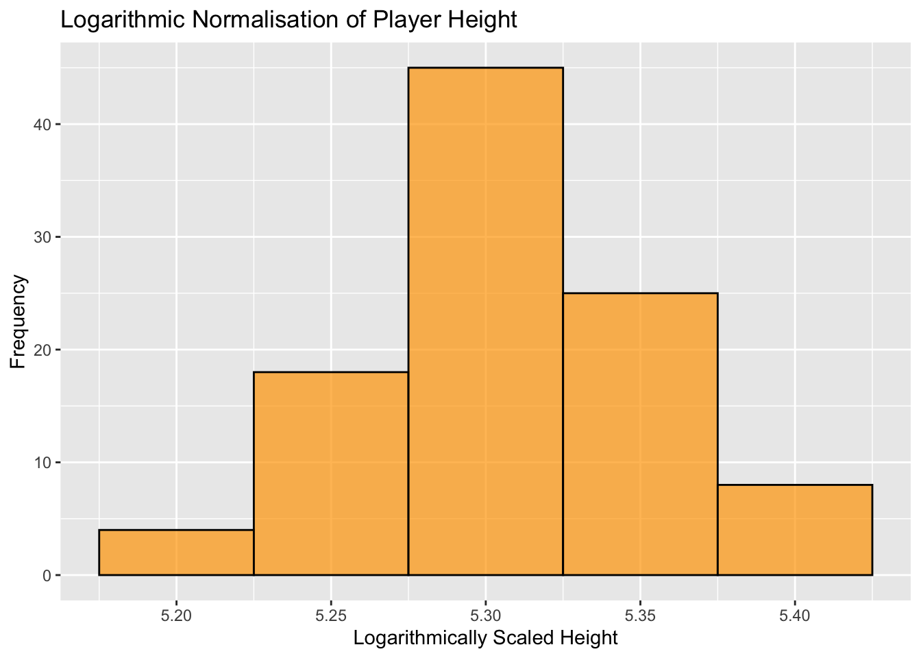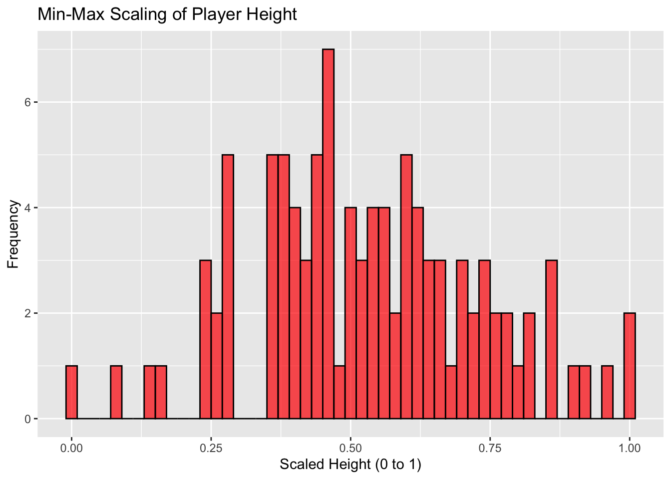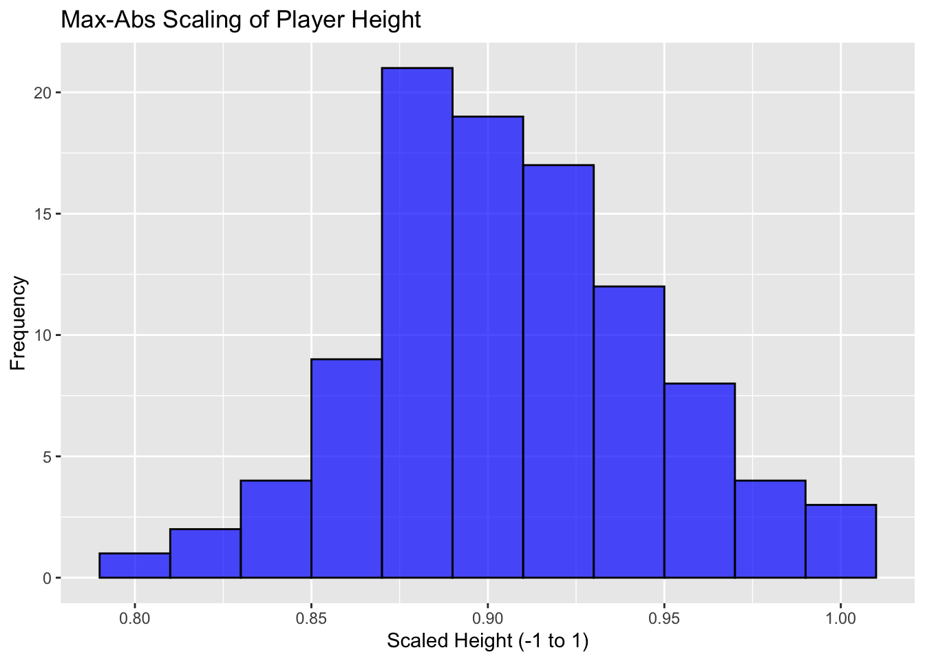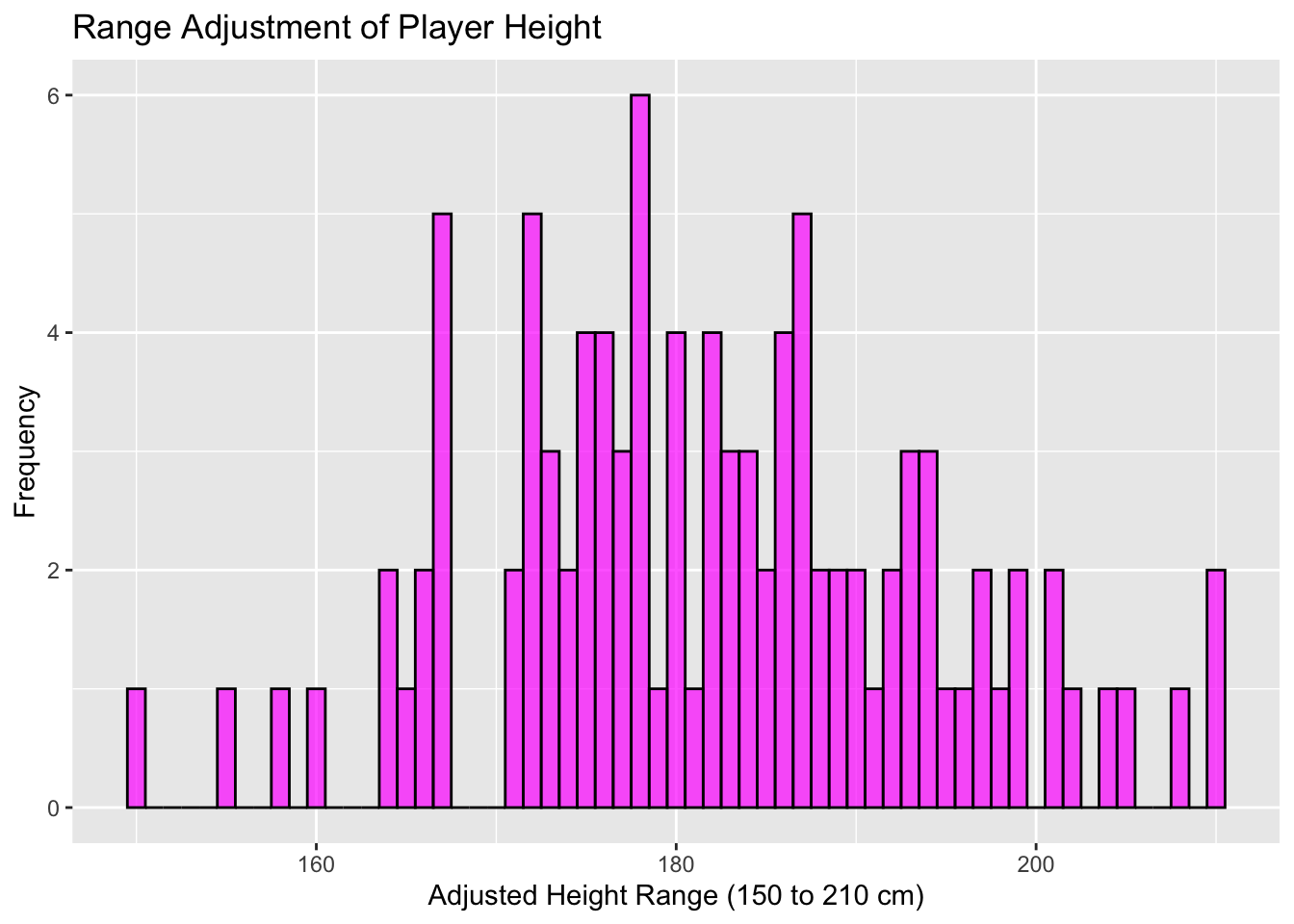 There are a few common approaches to scaling that we’ll cover in the following section. We’ll start with the following data, which is a frequency plot of player height (cm).
