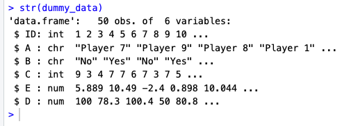 In R, you can type the ‘str’ function to get a quick overview of the different types of data in your dataset.