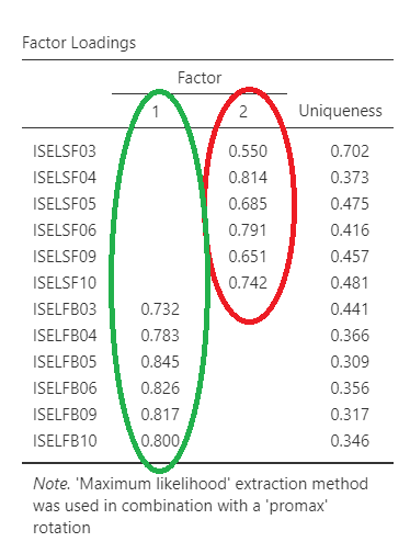In the figure above, we can see that some observed items (questions ISELFB03-ISELFB10) appear to be associated with Factor 1 (we call this ‘loading’ on Factor 1), and other items appear to be associated (load) with Factor 2. This is an example of ‘factor structure’.