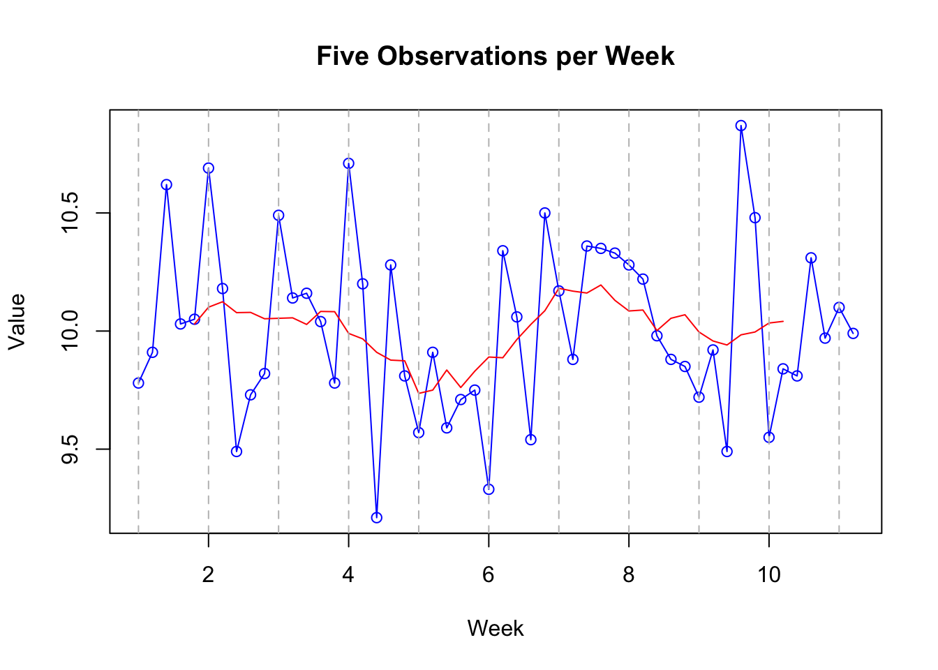 plot(ts_data_02, type = "o", col = "blue", main = "Five Observations per Week", xlab = "Week", ylab = "Value")