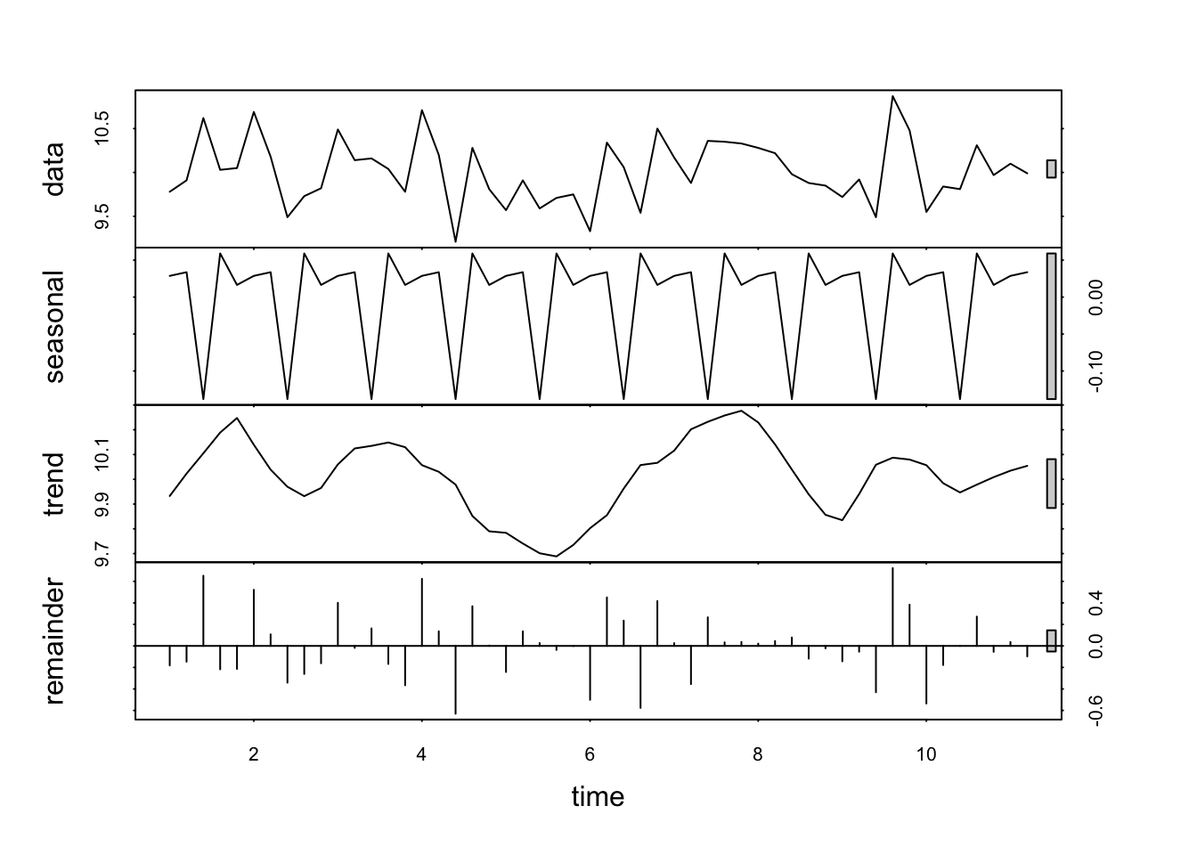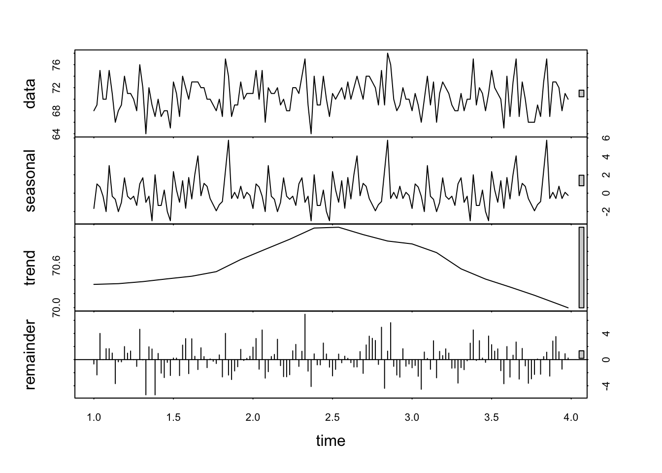 The resulting plot has four panels, each representing a different component of the time series. Because R understands that this data is in the form of a time-series, it can examine some specific features of such data.