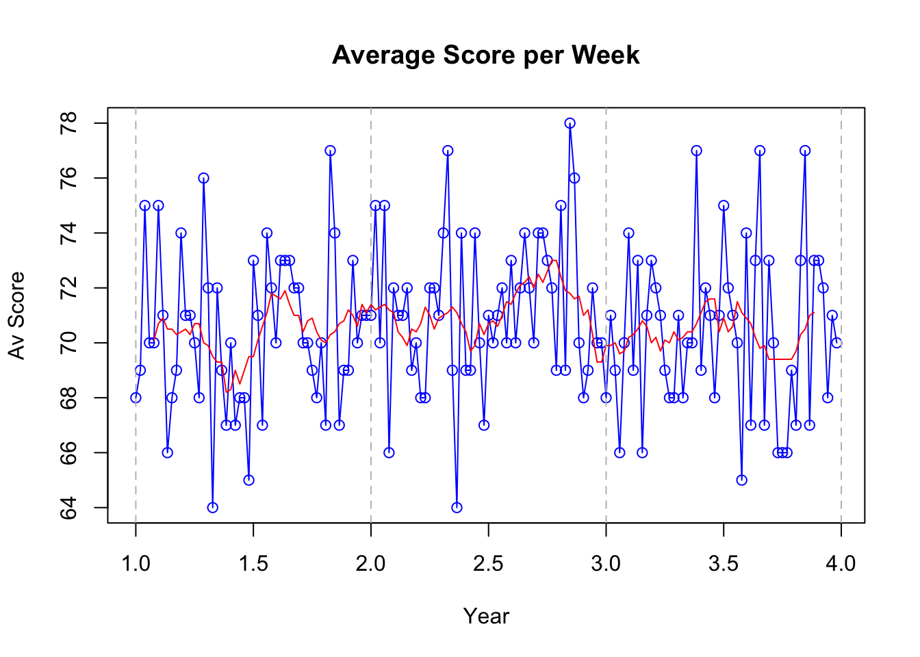 plot(golf_data, type = "o", col = "blue", main = "Average Score per Week", xlab = "Year", ylab = "Av Score")