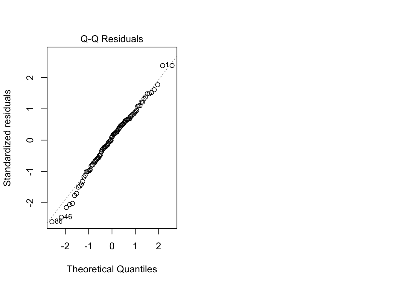 par(mfrow=c(1,2))plot(model, which=2) # Q-Q Plot