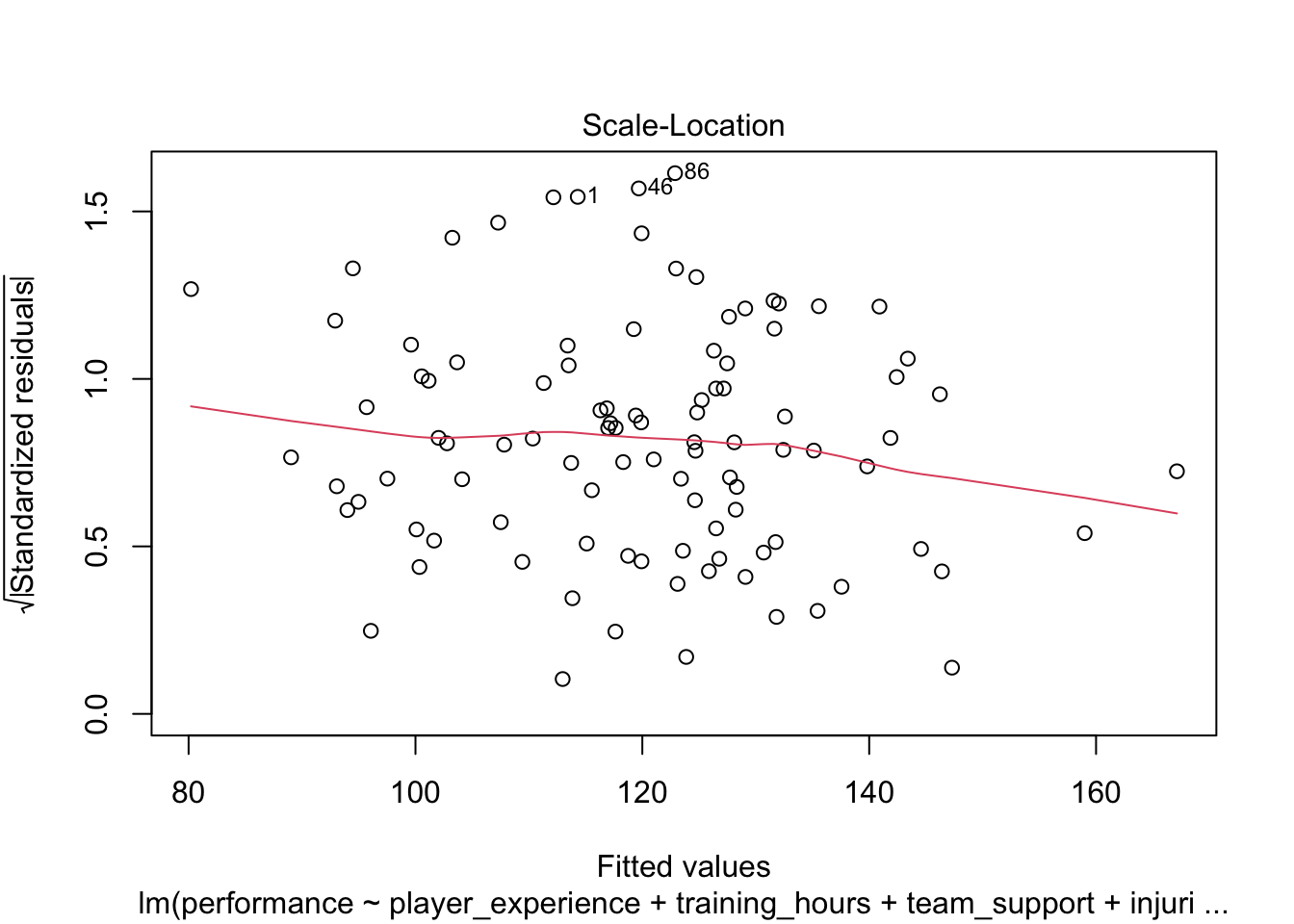 Interpretation: The residuals vs fitted plot should show no clear pattern; a random scatter suggests linearity holds.