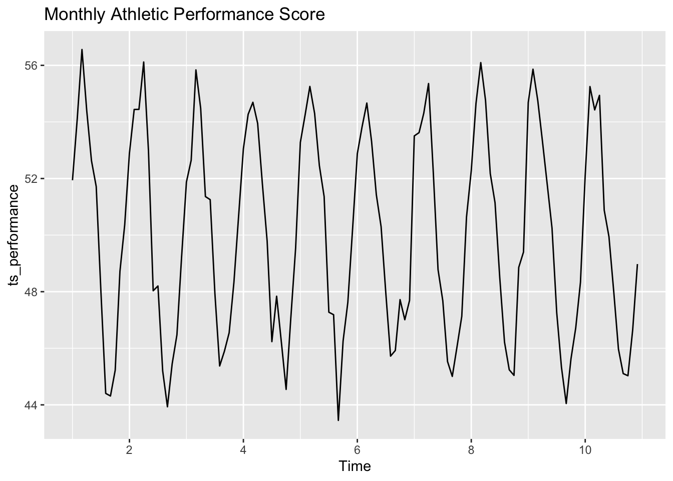 set.seed(123)time <-1:120# Simulate a seasonal pattern (e.g., peak performance during summer months)seasonality <-5*sin(2* pi * time /12)noise <-rnorm(120, mean =0, sd =1)performance <-50+ seasonality + noise # Base performance score with seasonal variationts_performance <-ts(performance, frequency =12)autoplot(ts_performance) +ggtitle("Monthly Athletic Performance Score")