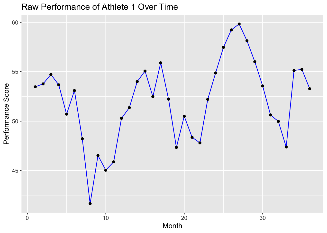 # Plot Raw Performance for a Single Athlete# visualise raw performance of athlete 1 over time.data %>%filter(athlete =="1") %>%ggplot(aes(x = month, y = performance)) +geom_line(color ="blue") +geom_point() +ggtitle("Raw Performance of Athlete 1 Over Time") +xlab("Month") +ylab("Performance Score")