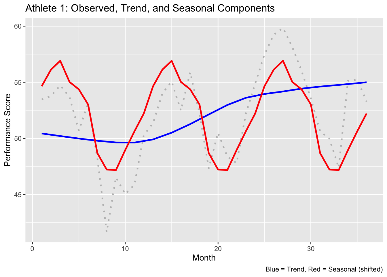 # Seasonal Decomposition (STL)# Nest data by athlete - each athlete's performance series can be decomposed individually.data_nested <- data %>%group_by(athlete) %>%nest()# For each athlete, create a time series object (with frequency 12) and perform STL decomposition.# Then immediately extract the trend and seasonal components.data_nested <- data_nested %>%mutate(ts_obj =map(data, ~ts(.x$performance, frequency =12)),stl_decomp =map(ts_obj, ~stl(.x, s.window ="periodic")),trend =map(stl_decomp, ~as.numeric(.x$time.series[, "trend"])),seasonal =map(stl_decomp, ~as.numeric(.x$time.series[, "seasonal"]))) %>%# Remove the raw time series and STL objects to simplify later steps.select(-ts_obj, -stl_decomp)# Visualisation: Decomposition for Athlete 1# Extract data for athlete 1 and create a data frame for plotting.athlete1 <- data_nested %>%filter(athlete =="1")athlete1_decomp <-data.frame(month =1:n_months,trend = athlete1$trend[[1]],seasonal = athlete1$seasonal[[1]],observed = data %>%filter(athlete =="1") %>%pull(performance))# Plot observed performance, trend, and seasonal componentsggplot(athlete1_decomp, aes(x = month)) +geom_line(aes(y = observed), color ="gray", size =1, linetype ="dotted") +geom_line(aes(y = trend), color ="blue", size =1) +geom_line(aes(y = seasonal +mean(observed)), color ="red", size =1) +ggtitle("Athlete 1: Observed, Trend, and Seasonal Components") +xlab("Month") +ylab("Performance Score") +labs(caption ="Blue = Trend, Red = Seasonal (shifted)")