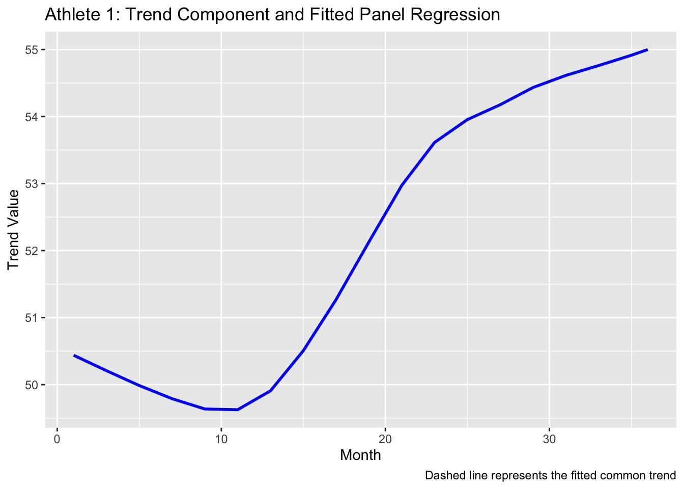 # Modeling Trend Component via Panel Regression# Unnest trend values along with a month index for each athlete.trend_data <- data_nested %>%select(athlete, trend) %>%mutate(month =list(1:n_months)) %>%# Create a month index for each athleteunnest(cols =c(month, trend)) %>%rename(trend_value = trend)# Run a panel regression (pooled model) on the extracted trend component.trend_panel <-plm(trend_value ~ month, data = trend_data, index =c("athlete", "month"), model ="pooling")summary(trend_panel)