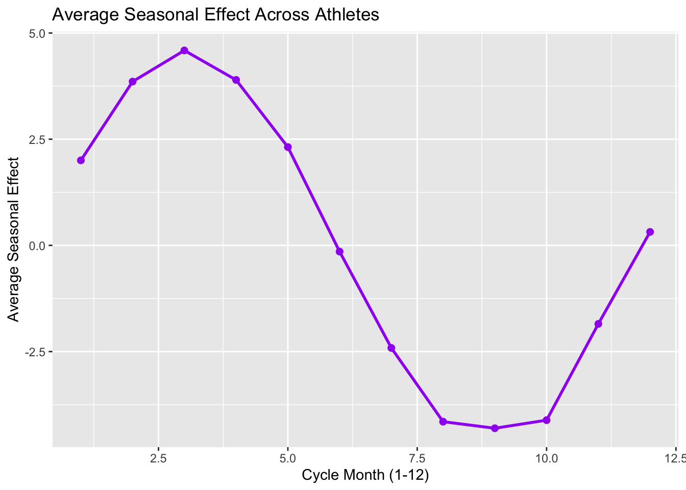 # Plot the Average Seasonal Patternggplot(avg_seasonal, aes(x = cycle_month, y = avg_seasonal)) +geom_line(color ="purple", size =1) +geom_point(color ="purple", size =2) +ggtitle("Average Seasonal Effect Across Athletes") +xlab("Cycle Month (1-12)") +ylab("Average Seasonal Effect")