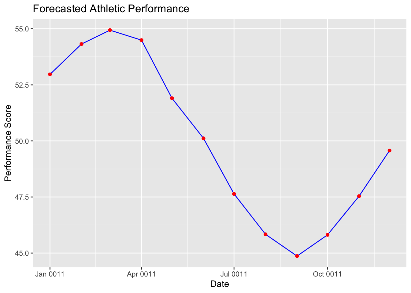 # Since frequency is 12, we take the first 12 months as the seasonal patternseasonal_pattern <- decomposed$seasonal[1:12]forecast_performance <- trend_forecast + seasonal_patternend_info <-end(ts_performance) # returns c(last_year, last_period)end_year <- end_info[1]end_period <- end_info[2]if(end_period ==frequency(ts_performance)) { start_year <- end_year +1 start_month <-1} else { start_year <- end_year start_month <- end_period +1}start_date <-as.Date(sprintf("%d-%02d-01", start_year, start_month))future_dates <-seq(start_date, by ="month", length.out =12)# Create a data frame with forecast dates and valuesforecast_df <-data.frame(Date = future_dates, Forecast = forecast_performance)# Plot forecastggplot(forecast_df, aes(x = Date, y = Forecast)) +geom_line(color ="blue") +geom_point(color ="red") +ggtitle("Forecasted Athletic Performance") +xlab("Date") +ylab("Performance Score")