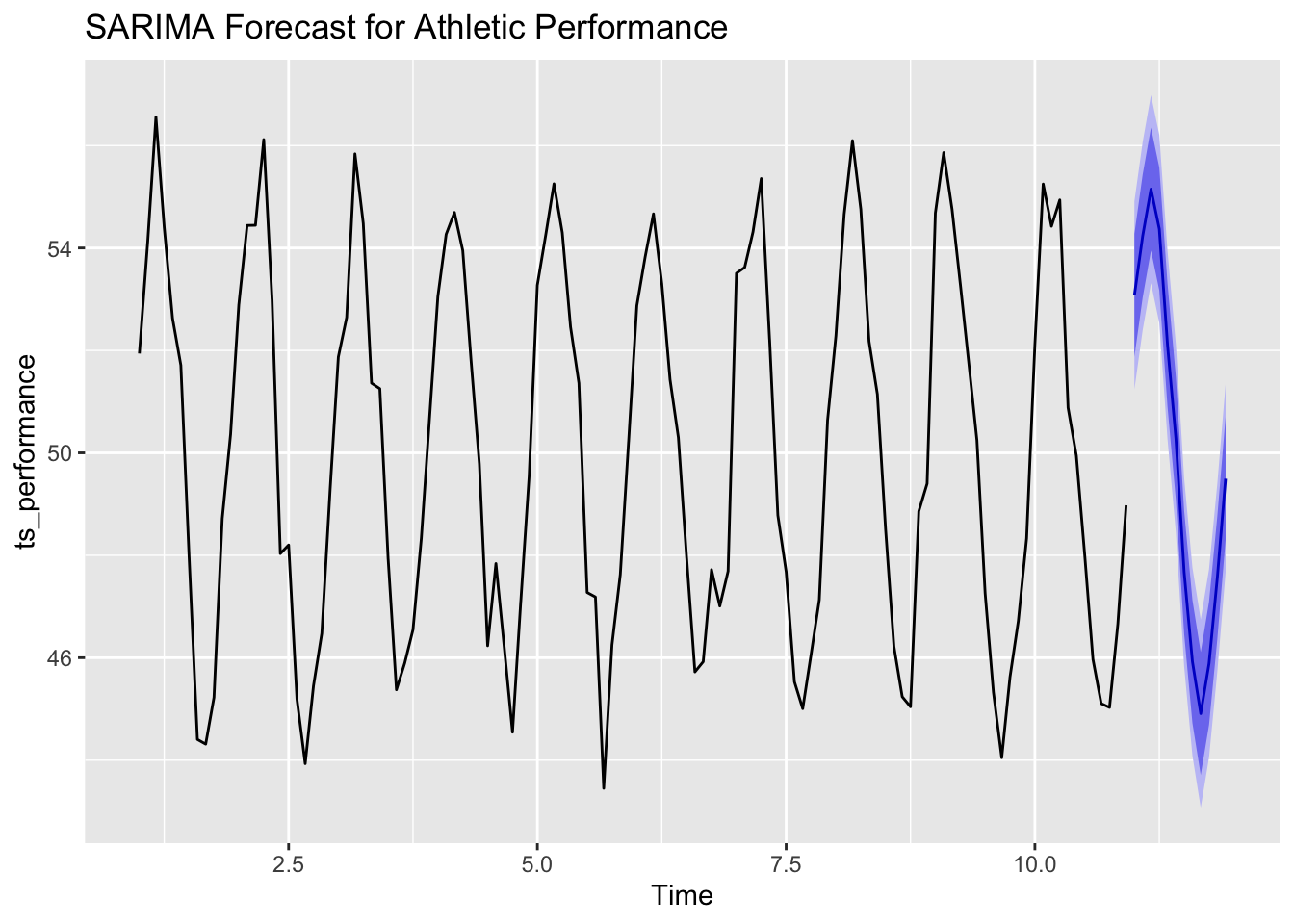 forecast_sarima <-forecast(sarima_model, h =12)autoplot(forecast_sarima) +ggtitle("SARIMA Forecast for Athletic Performance")