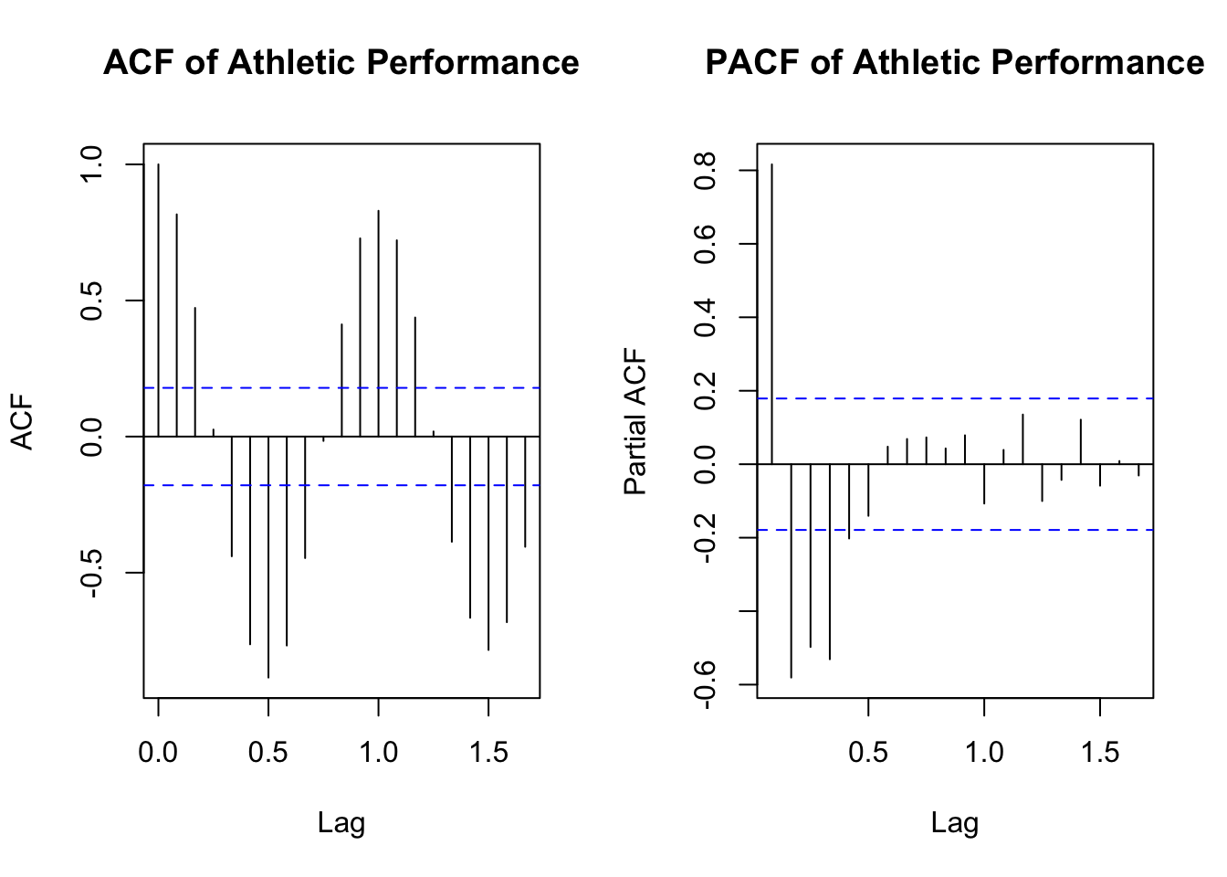 par(mfrow =c(1,2))acf(ts_performance, main ="ACF of Athletic Performance")pacf(ts_performance, main ="PACF of Athletic Performance")